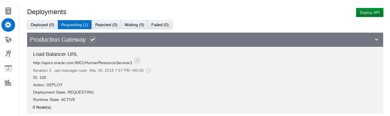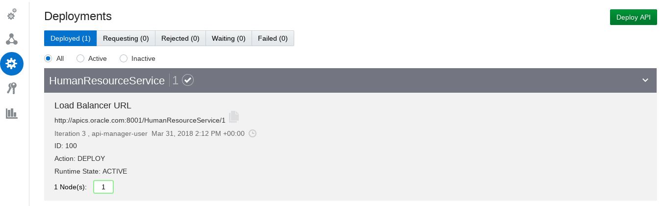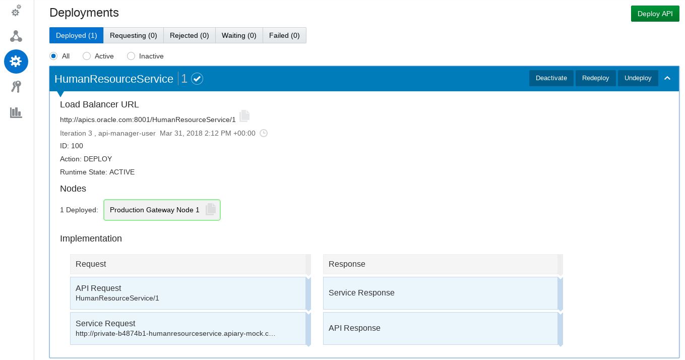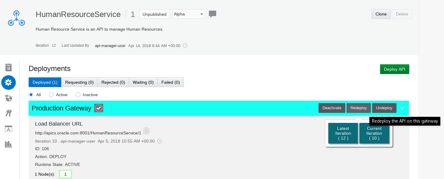 Navigate to tab “Deployments” of the “HumanResourceService” API, and then hover over the “Production Gateway” gateway and then, on the right, hover over the icon “Redeploy”.