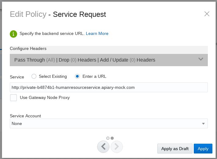 When a request meets all policy conditions, the gateway routes the request to this URL and calls your service. Note that the Service Request URL can point to any of your service’s resources, not just its base URL. This way you can restrict users to access only a subset of your API’s resources.