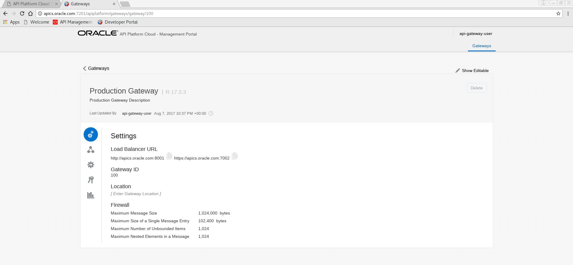 First l will give you a short overview of screenshot’s of each of the tabs on the left. Some of these I will explain in more detail as I will walk you through some of the functionality of Oracle API Platform CS.