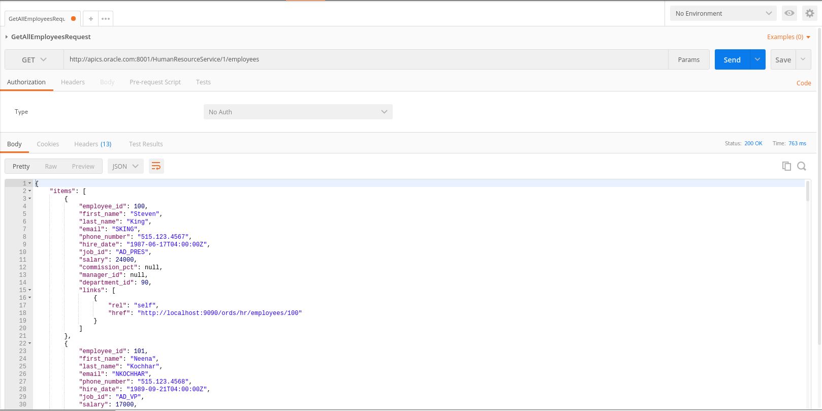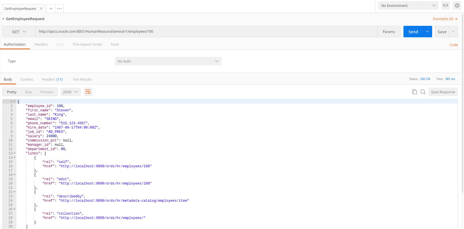 From Postman I invoked the request named “GetEmployeeRequest” (with method “GET” and URL “http://apics.oracle.com:8001/HumanResourceService/1/employees/100”) and a response with “Status 200 OK” is shown: