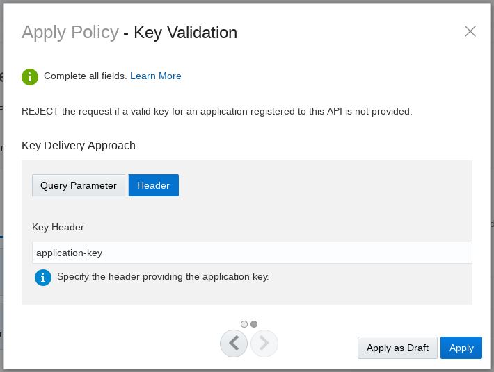 Keys are distributed to clients when they register to use an API on the Developer Portal. At runtime, if they key is not present in the given header or query parameter, or if the application is not registered, the request is rejected; the client receives a 400 Bad Request error if no key validation header or query parameter is passed or a 403 Forbidden error if an invalid key is passed.