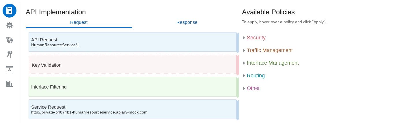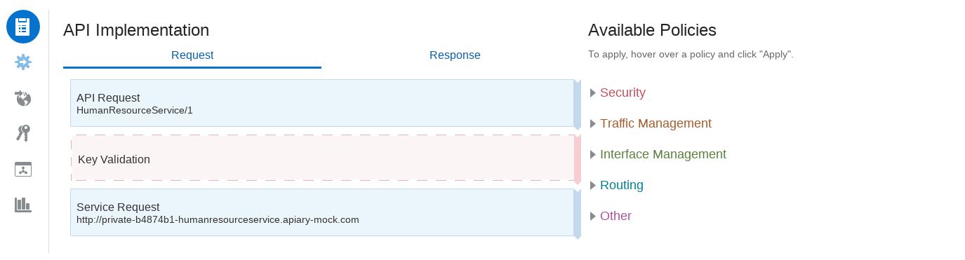 After you create an API, you can apply policies to configure the Request and Response flows. Policies in the Request flow secure, throttle, route, manipulate, or log requests before they reach the backend service. Polices in the Response flow manipulate and log responses before they reach the requesting client.