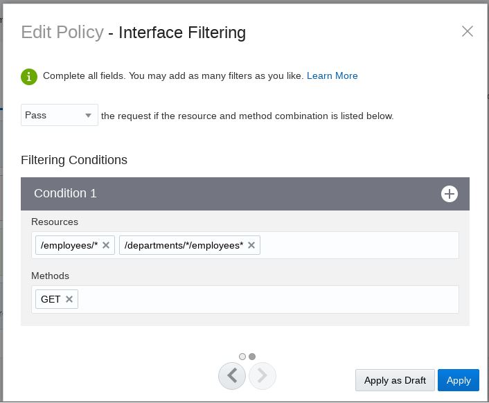 I want to use an interface filtering policy to filter requests. As an example, I want to pass requests (to the backend service) with the method GET specified in the request and a resource starting with employees followed by an identification or starting with departments followed by employees and an identification.