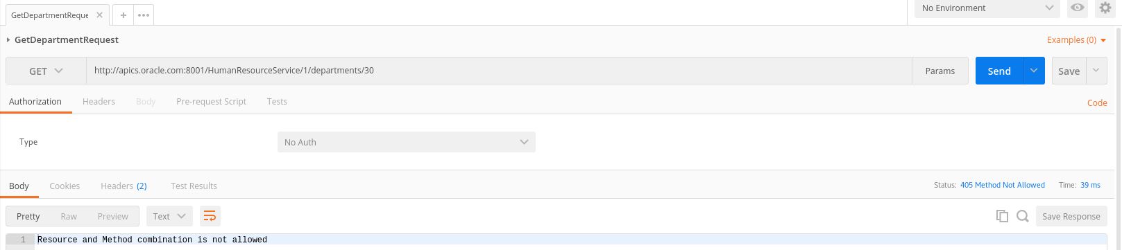 From Postman I invoked the request named “GetDepartmentRequest” (with method “GET” and URL “http://apics.oracle.com:8001/HumanResourceService/1/departments/30”) and a response with “Status 405 Method Not Allowed” is shown: