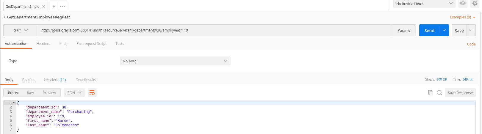 From Postman I invoked the request named “GetDepartmentEmployeeRequest” (with method “GET” and URL “http://apics.oracle.com:8001/HumanResourceService/1/departments/30/employees/119”) and a response with “Status 200 OK” is shown: