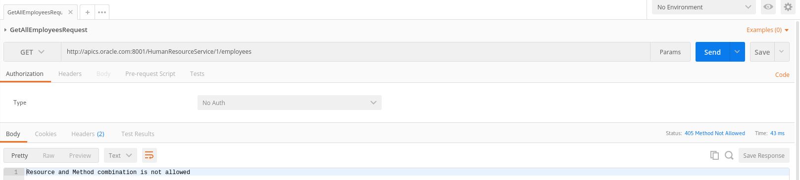 From Postman I invoked the request named “GetAllEmployeesRequest” (with method “GET” and URL “http://apics.oracle.com:8001/HumanResourceService/1/employees”) and a response with “Status 405 Method Not Allowed” is shown: