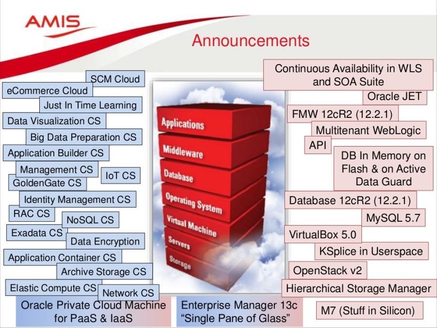 - A new chip, the M7, with build-in security, which is inherited by all the software on top of it. It is only available for the Solaris machine-range which are not used in the Oracle Cloud, but it is a new technique to keep an eye on.