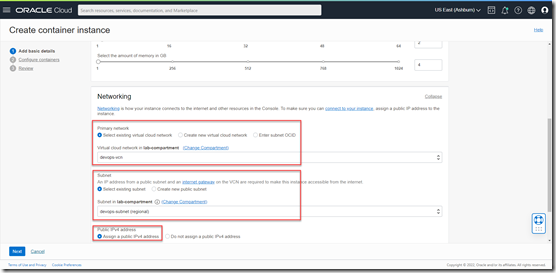 Next, configure networking. This means: specifying the VCN and subnet to which the container instance is attached and whether or not to assign a Public IP address to the Container Instance.