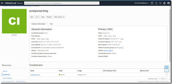 This article shows an example of running a PostgreSQL 15 database on Container Instances – something that is now really simple. The tutorial reference in the resources section describes how to run a WordPress container that connects to a MySQL container both running on the same Container Instance – a quite instructive and easy to follow along example.