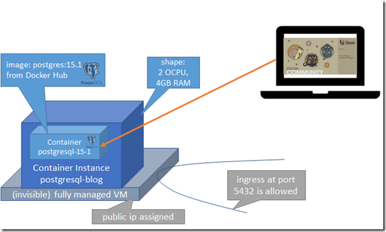 The container is running inside the instance. That means that I now have a PostgreSQL 15.1 instance at my disposal. However, in order to actually get to it, a little network configuration is to be made: I have to allow network traffic on the subnet from anywhere to port 5432 on which the container exposes the PostgreSQL instance.