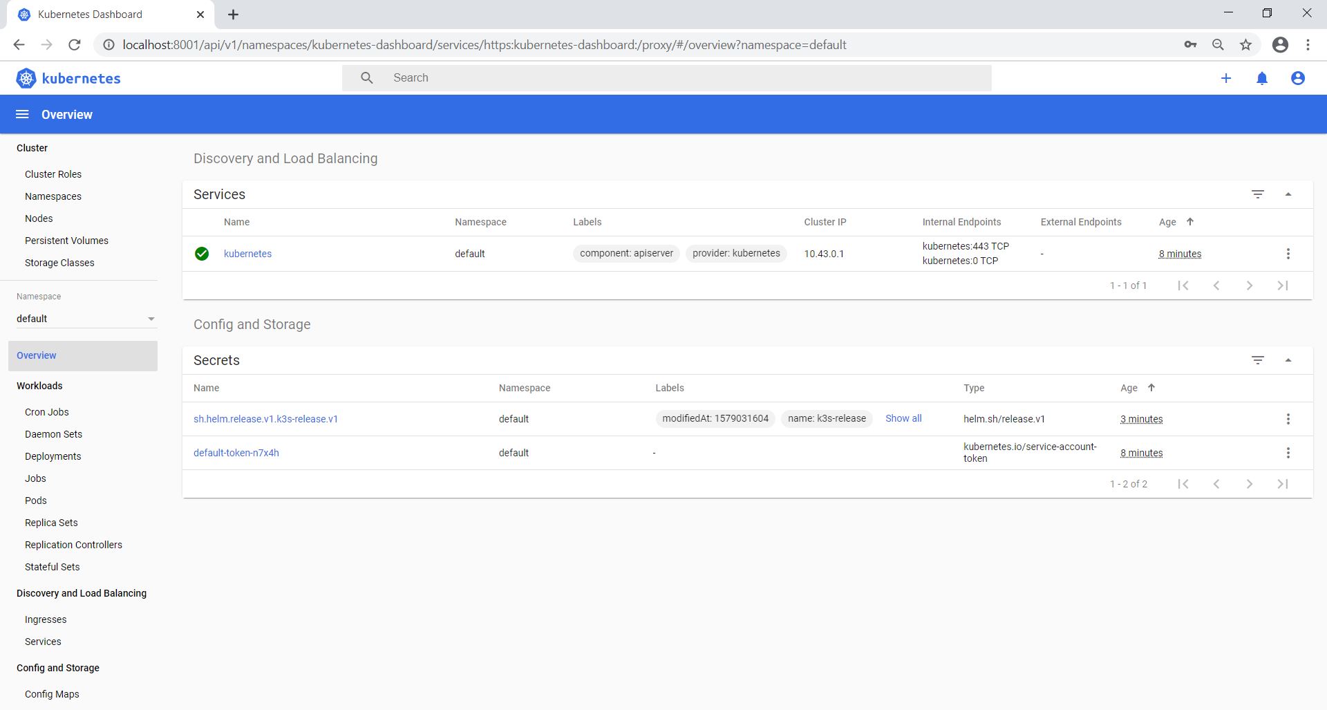 The Kubernetes Dashboard was opened with the default namespace selected.