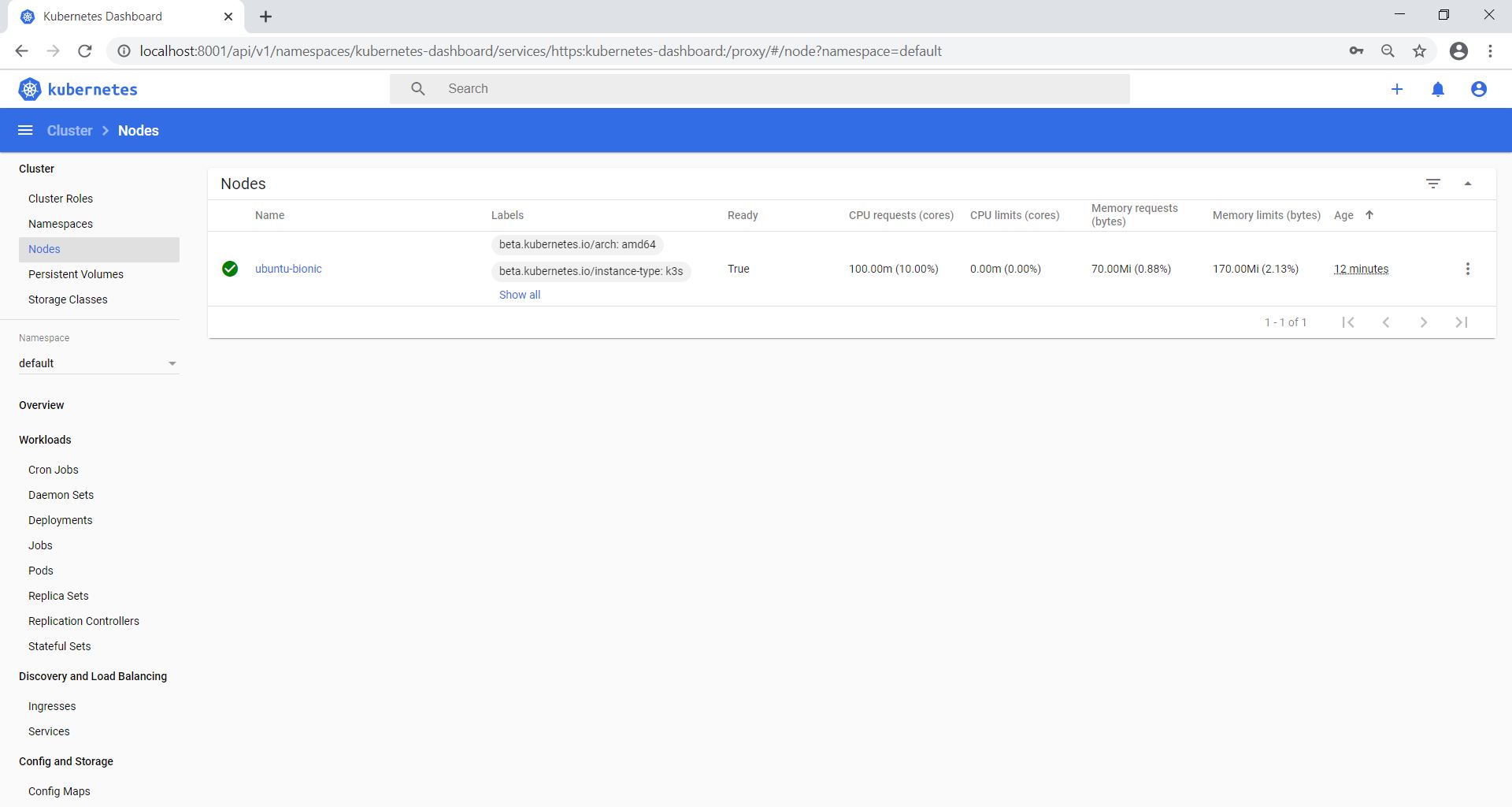 Next, I navigated to Nodes. Here you can see that the Kubernetes Cluster consists of one Node.