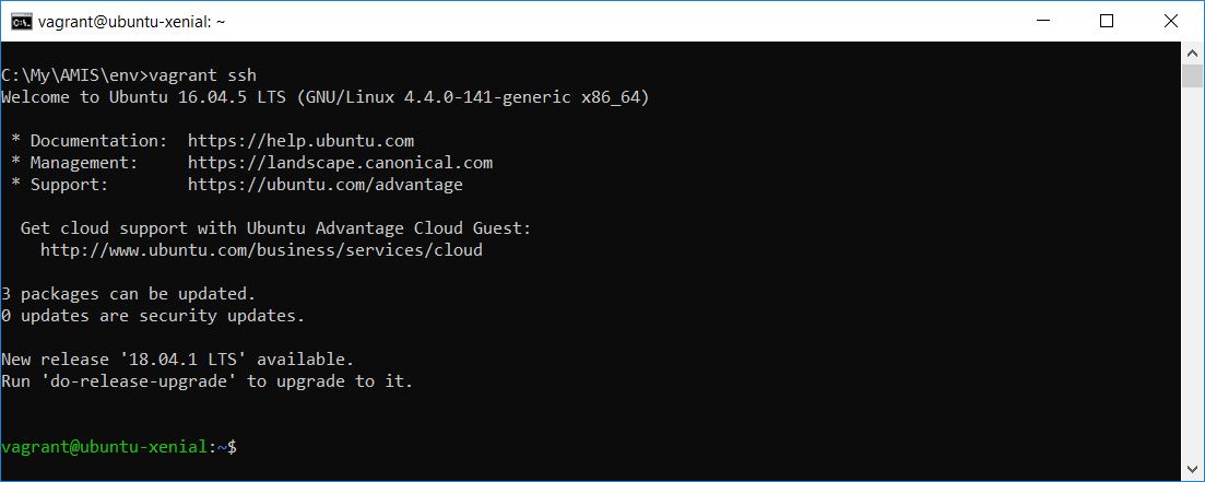 Go to the env directory and open a Windows Command Prompt (cmd) to access linux (within the VirtualBox Appliance) via ssh: vagrant ssh