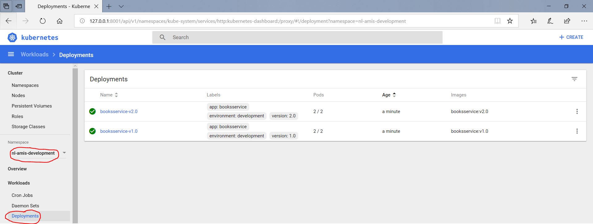 NAMESPACE NAME DESIRED CURRENT UP-TO-DATE AVAILABLE AGE kube-system coredns 2 2 2 2 38m kube-system kubernetes-dashboard 1 1 1 1 38m nl-amis-development booksservice-v1.0 2 2 2 2 36s nl-amis-development booksservice-v2.0 2 2 2 2 23s nl-amis-testing booksservice-v1.0 2 2 2 2 10s nl-amis-testing mysql 1 1 1 1 34m