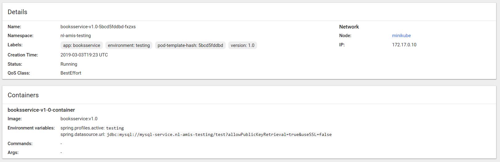 NAMESPACE NAME READY STATUS RESTARTS AGE kube-system coredns-576cbf47c7-8v48m 1/1 Running 0 54m kube-system coredns-576cbf47c7-n4b9r 1/1 Running 0 54m kube-system etcd-minikube 1/1 Running 0 53m kube-system kube-addon-manager-minikube 1/1 Running 0 53m kube-system kube-apiserver-minikube 1/1 Running 0 53m kube-system kube-controller-manager-minikube 1/1 Running 0 53m kube-system kube-proxy-clpgn 1/1 Running 0 54m kube-system kube-scheduler-minikube 1/1 Running 0 53m kube-system kubernetes-dashboard-5bff5f8fb8-z2cfc 1/1 Running 0 54m kube-system storage-provisioner 1/1 Running 0 54m nl-amis-development booksservice-v1.0-68785bc6ff-k9cg6 1/1 Running 0 16m nl-amis-development booksservice-v1.0-68785bc6ff-q2fkj 1/1 Running 0 16m nl-amis-development booksservice-v2.0-869c5bb47d-6shjh 1/1 Running 0 16m nl-amis-development booksservice-v2.0-869c5bb47d-dqftq 1/1 Running 0 16m nl-amis-testing booksservice-v1.0-5bcd5fddbd-fxzxs 1/1 Running 0 16m nl-amis-testing booksservice-v1.0-5bcd5fddbd-pb64h 1/1 Running 0 16m nl-amis-testing mysql-64846c7974-cnmch 1/1 Running 0 50m