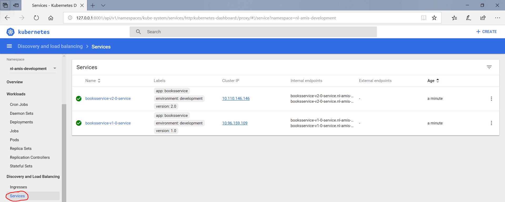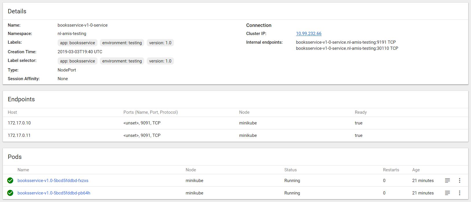 NAMESPACE NAME TYPE CLUSTER-IP EXTERNAL-IP PORT(S) AGE default kubernetes ClusterIP 10.96.0.1 <none> 443/TCP 56m kube-system kube-dns ClusterIP 10.96.0.10 <none> 53/UDP,53/TCP 56m kube-system kubernetes-dashboard ClusterIP 10.97.35.192 <none> 80/TCP 55m nl-amis-development booksservice-v1-0-service NodePort 10.96.159.109 <none> 9190:30010/TCP 37s nl-amis-development booksservice-v2-0-service NodePort 10.110.146.146 <none> 9190:30020/TCP 26s nl-amis-testing booksservice-v1-0-service NodePort 10.99.232.66 <none> 9191:30110/TCP 13s nl-amis-testing mysql-service ClusterIP None <none> 3306/TCP 52m