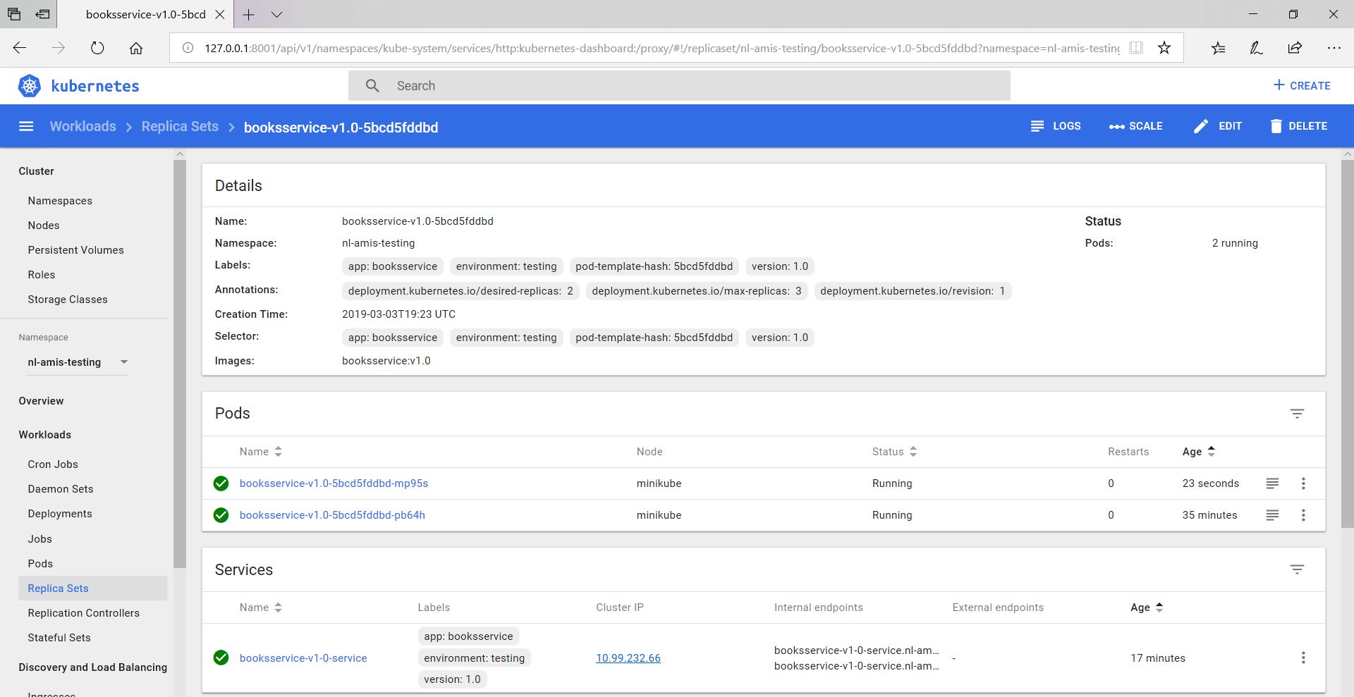 Each deployment I have created contains a Replica Set. Let’s for example focus on the testing namespace. Click on booksservice-v1.0.