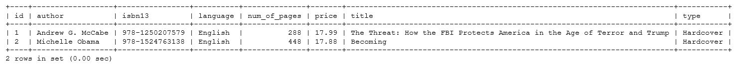 [{"id":"1","title":"The Threat: How the FBI Protects America in the Age of Terror and Trump","author":"Andrew G. McCabe","type":"Hardcover","price":17.99,"numOfPages":288,"language":"English","isbn13":"978-1250207579"},{"id":"2","title":"Becoming","author":"Michelle Obama","type":"Hardcover","price":17.88,"numOfPages":448,"language":"English","isbn13":"978-1524763138"}]