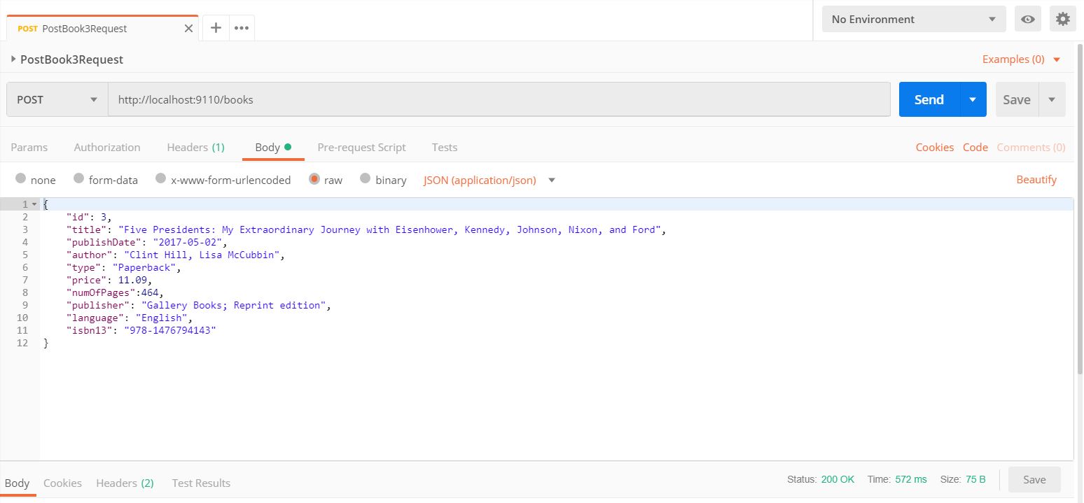 From Postman I invoked a request named “PostBook3Request” (with method “POST” and URL “http://locahost:9110/books”) and a response with “Status 200 OK” was shown: