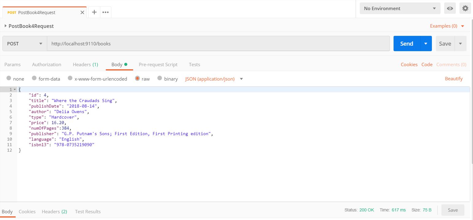 Next, from Postman I invoked a request named “PostBook4Request” (with method “POST” and URL “http://locahost:9110/books”) and a response with “Status 200 OK” was shown: