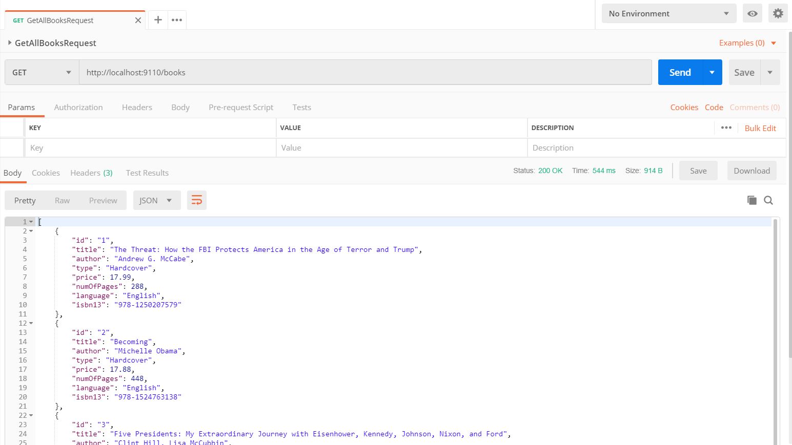 From Postman I invoked a request named “GetAllBooksRequest” (with method “GET” and URL “http://locahost:9110/books”) and a response with “Status 200 OK” was shown:
