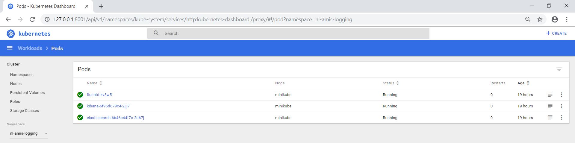 Check via the Kubernetes Web UI (Dashboard) that the deployment is created (in the nl-amis-logging namespace):