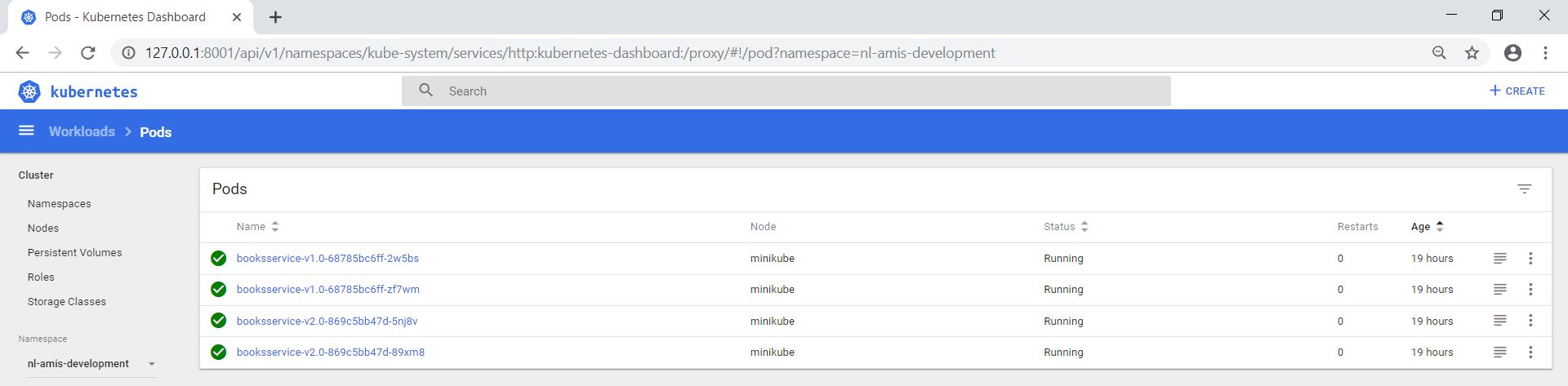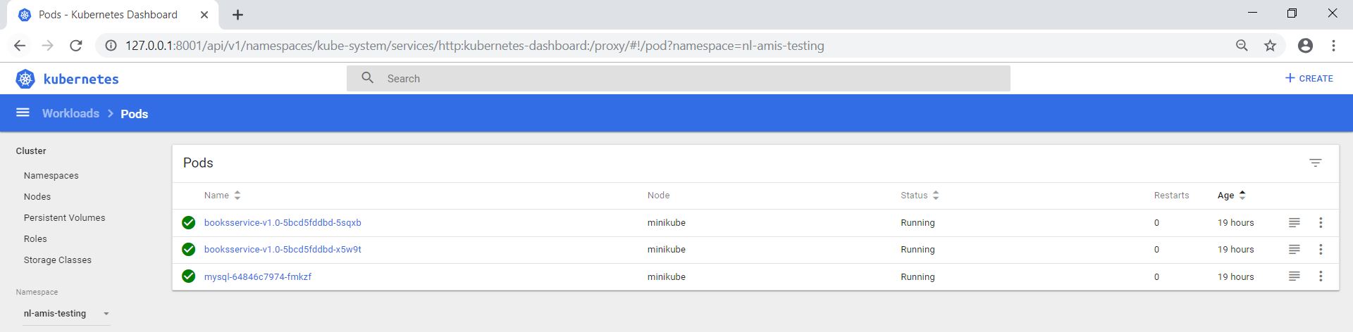 Next, via the Minikube Dashboard I deleted one of the booksservice-v1.0 pods in the nl-amis-testing namespace. The ReplicaSet ensures that 2 pod replicas are running at any given time. So, a new pod is automatically created and the BooksService application started.