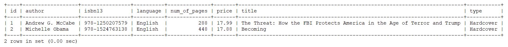 ubuntu_minikube_helm_efk: [{"id":"1","title":"The Threat: How the FBI Protects America in the Age of Terror and Trump","author":"Andrew G. McCabe","type":"Hardcover","price":17.99,"numOfPages":288,"language":"English","isbn13":"978-1250207579"},{"id":"2","title":"Becoming","author":"Michelle Obama","type":"Hardcover","price":17.88,"numOfPages":448,"language":"English","isbn13":"978-1524763138"}]