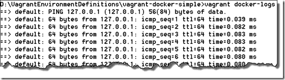 The CMD parameter in the Docker provider section in the Vagrantfile – [“ping”, “-c 51”, “127.0.0.1”] – tells Docker to have the container execute the ping statement as soon as it is running – pinging the localhost (127.0.0.1). This statement is repeated 51 times.