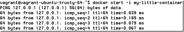 Alternatively, we can start the container in interactive mode (which is more or less a combination of start and attach) using docker start -i <container id> which in this case means we start viewing the output from the repeated ping command.