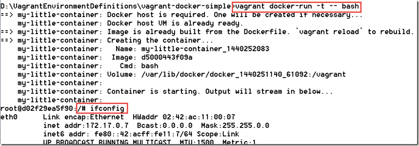 Executing commands in a container can also be done from the Vagrant (or Windows) host, using the vagrant instruction docker-run. This will start a container (not reuse an already running one), execute the command and close the container. To open a bash shell into the my-little-container container from the Windows host, use: vagrant docker-run -t — bash.