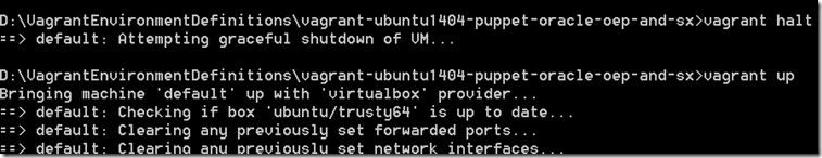 Then clone the GitHub repository – https://github.com/lucasjellema/vagrant-ubuntu1404-puppet-oracle-oep-and-sx – to your local machine or simply download the repository as zip-file and expand the file in a local directory. I am assuming a Windows Host, but the steps are almost the same for Linux, MacOS or other hosts.