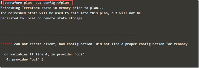 terraform plan -out config.tfplan -var compartment_id=$TF_VAR_compartment_id -var namespace=my-namespace-$some_env_var