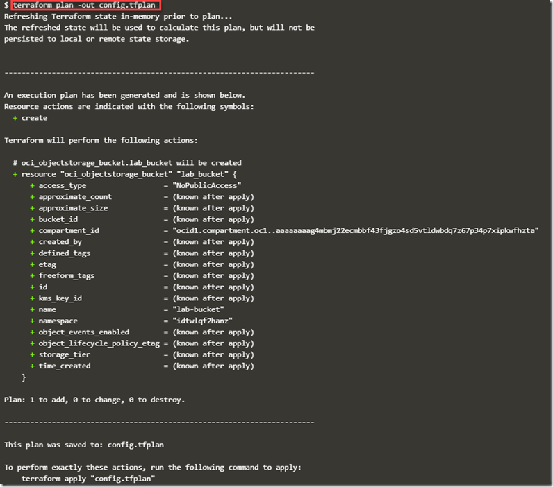 terraform plan -out config.tfplan -var compartment_id=<OCID of compartment>  -var namespace=<namespace>