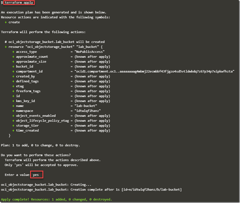 One resource is managed by Terraform (the bucket) and after entering yes it is created. Using terraform apply it is created again. All much faster than I could get it done in the console.