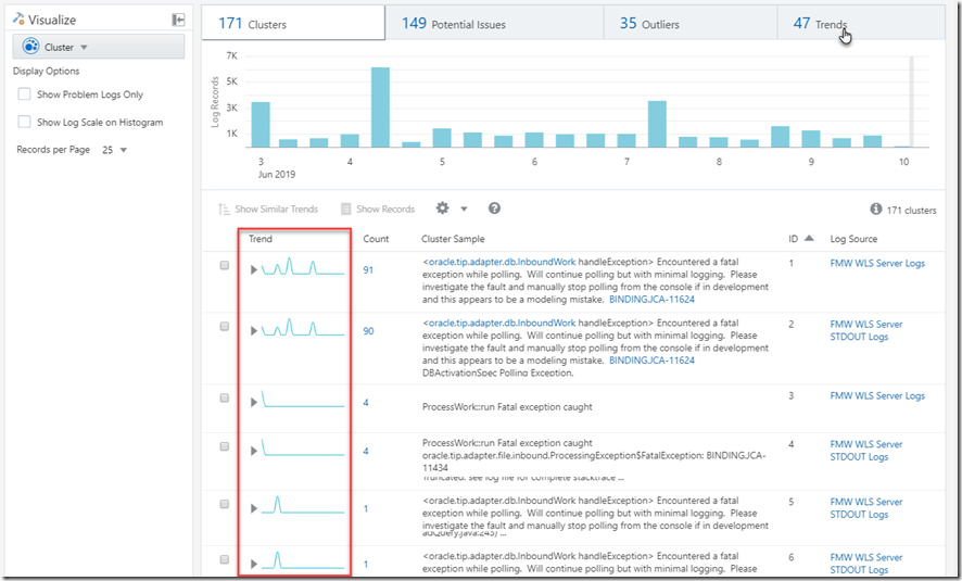 This means that the log messages are inspected for their pattern: all messages indicating a full disk, a failed HTTP call or a Time Out exception for example will be similar. The name of the disk, the specific endpoint and the JDBC Data Source and SQL statement will be different, but the overall message pattern will be the same for all messages relating a similar issue. By clustering the log entries based on their common pattern, we can very quickly get some hold on which types of errors we are dealing with.