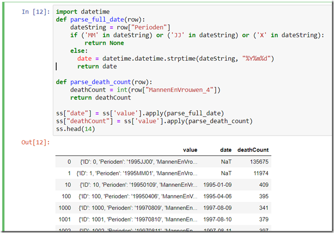 Column date is derived by processing each JSON record and parsing the Perioden property that contains the date (or month or year). The date value is a true Python DateTime instead of a string that looks like a date. The deathCount is taken from the property MannenEnVrouwen_4 in the JSON record.