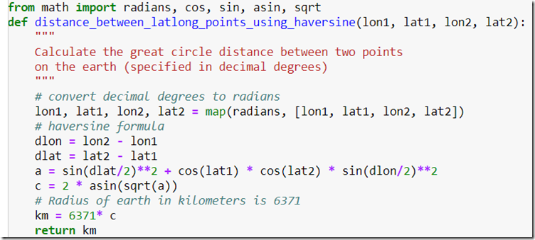 Here is a function to calculate the distance between two locations defined by longitude and lattitude; note: for my purpose, I could probably also use a simple Euclidean distance (based on Pythagoras), disregarding the spherical characteristics of the Earth’s surface and save some time.