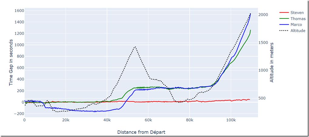 The altitude profile for this stage is quite distinct and the mountains play an important role in this stage. The next figure tells the stories of three men vs the mountains – with one man (Thomas) slowly falling behind on those steep climbs…