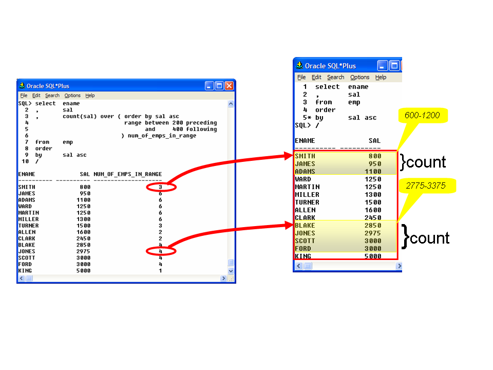 ENAME SAL NUM_OF_EMPS_IN_RANGE ---------- ---------- -------------------- SMITH 800 3 JAMES 950 6 ADAMS 1100 6 WARD 1250 6 MARTIN 1250 6 MILLER 1300 6 TURNER 1500 3 ALLEN 1600 2 CLARK 2450 2 BLAKE 2850 4 JONES 2975 4 SCOTT 3000 4 FORD 3000 4 KING 5000 1