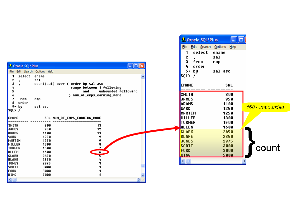 For example for ALLEN: there are 6 employees earning more than him. The Salary range window starting at 1601 (ALLEN’s salary+1) and extending indefinitely into the following salary values contains six records: from CLARK to KING.