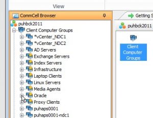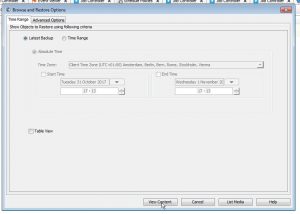 Go back to the commvault console. Again select in the “Client Computer Groups” tree the database name and then with the right mouse button select the “All Tasks” option. And then again select “Browse and Restore”. Click on “View Content”. Click in the left pane on the database name. In that way you select all tablespaces. Click on “Recover All Selected”.