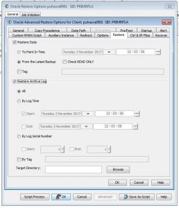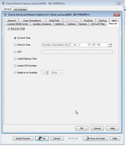 Next click on the Advanced button. On the tabs Restore and Recover you can choose restore and recovery to Current Time or choose point in time recovery. In this example we will choose restore to Current Time.