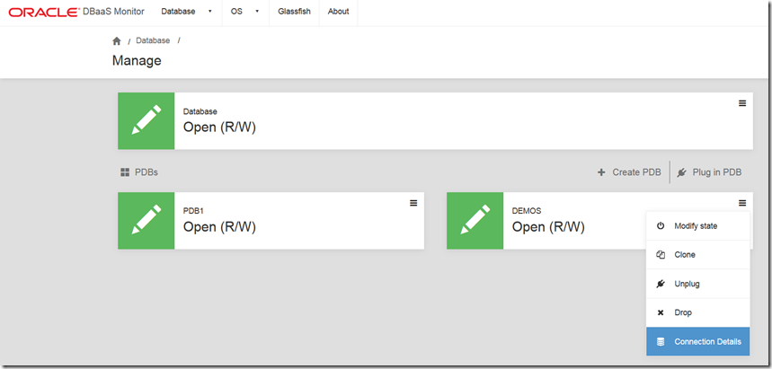 To create a SQL Developer connection into the HR schema in the DEMOS PDB, we need to use the service name for that PDB instead of the SID for the (container) database. We can find the service name in the DBaaS Monitor console: