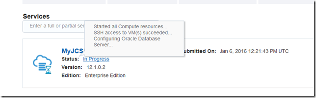 After pressing Next on this page and Create on the confirmation page, the request to provision this database instance is submitted and processed in the background. Presumably, a compute node is provisioned with Oracle Linux on it, probably the Oracle Database software, and subsequently the database configuration wizard is run.