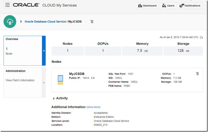 Here is the detail overview of the MyJCSDB instance – including the public IP address and other configuration details: