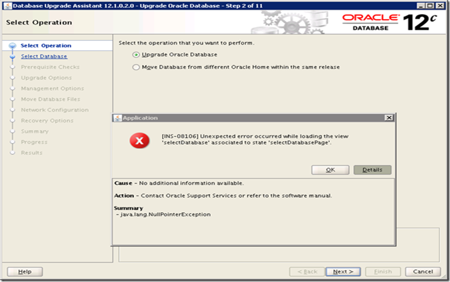 When you want to upgrade a 11.2 database to 12.1 on a (linux) server with 12.2 databases, you get a INS-08106 error when using the 12.1 dbua when loading the select database Page: