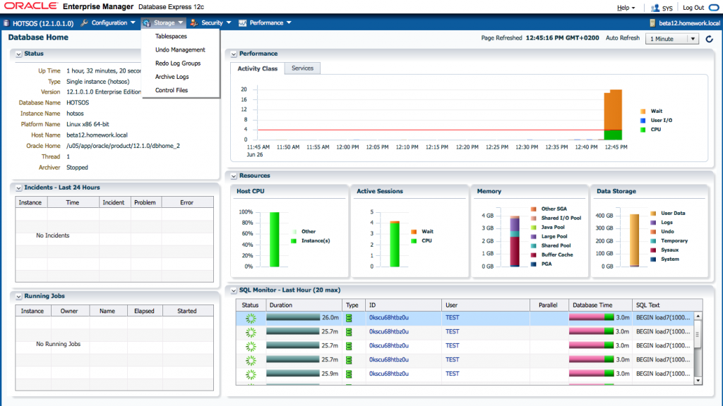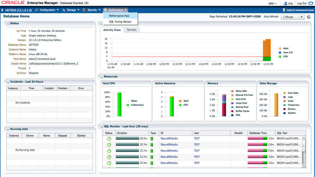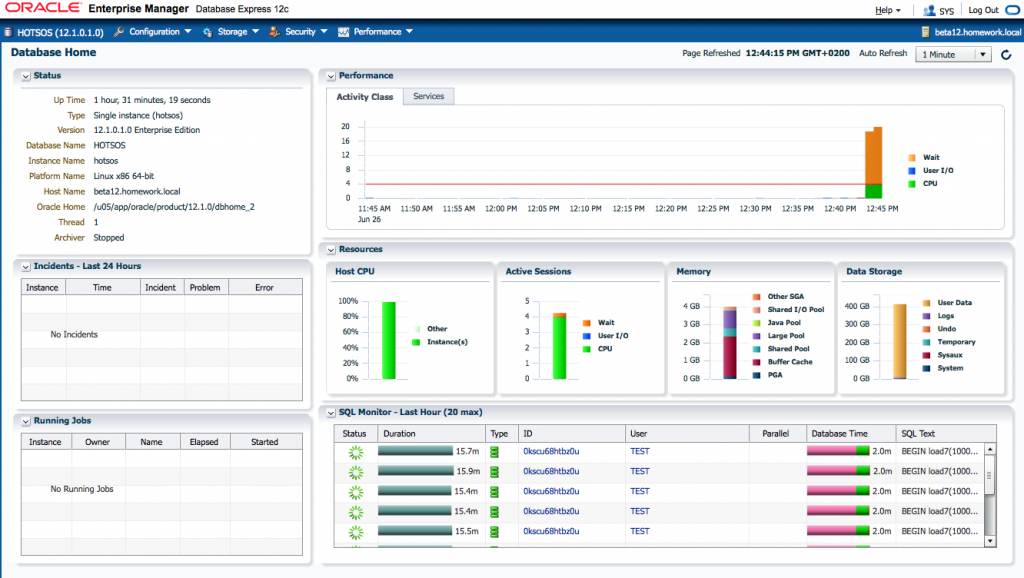 The new Database Express or DB Express database utility is different from the former DB Console. It is based on flash and “built-in” the database. To give you a small overview (sneak peek) into this great new tool for, for example, database performance tuning, hereby some pictures to create some appetite. I created some have load on my database, to make it a bit more interesting…