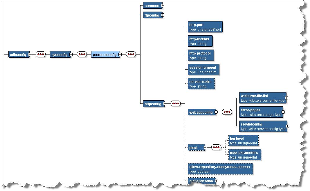 In its behavior and possibilities the xdbconfig.xml file has a lot in its look and feel like the Apache httpd.conf file or a server.xml file of an Application Server. The configuration defines for example MIME types, memory and locking behavior, configuration of “servlets” (naming probably derived from the WebDAV definitions) like HTTP, FTP, Native Database Web Services (NDWS), PL/SQL Gateways like local APEX support, security, etc., etc.