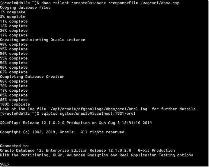 dbca -silent -createDatabase -responseFile /vagrant/dbca.rsp